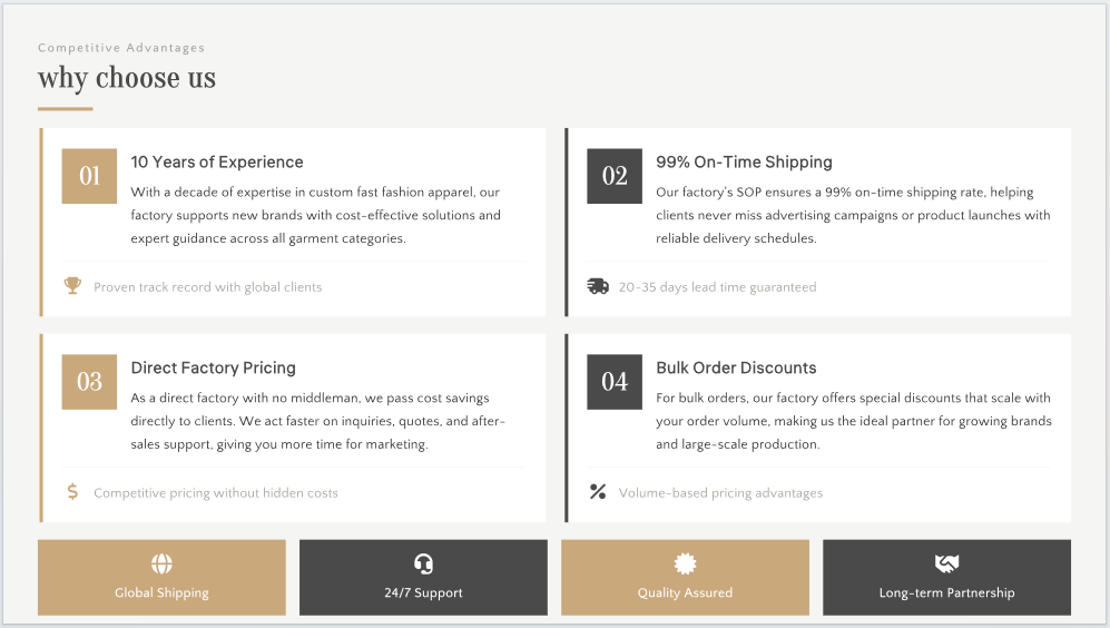 Our specialization spans Men/Women/Children's fast fashion and casual lines across woven, knits, and denim fabrics. From chic casual wear and sophisticated office attire to elegant evening wear and seasonal essentials, we deliver comprehensive apparel solutions tailored to your brand vision.